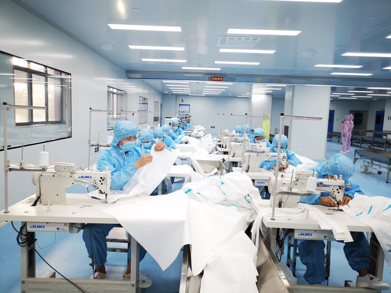 2020年7月7日,1200平10萬級潔凈車間開放投產。當天早上6:00,第一臺用于防護服生產機器進入無菌車間,經過基礎調試后,車間開始了緊張的生產,12分鐘后,第一件防護服正式下線。